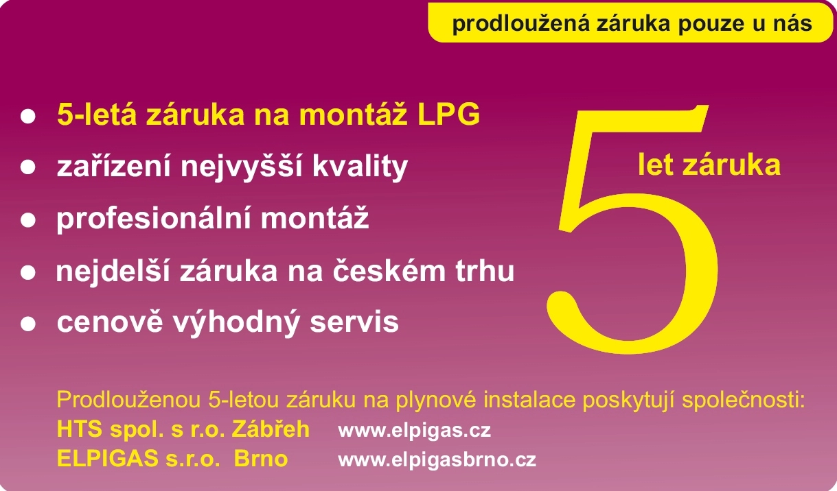 Dále společnosti HTS spol. s r.o. Zábřeh a ELPIGAS s.r.o. Brno jako jediné montážní firmy na českém trhu provádí přestavby vozidel na alternativní pohon LPG s 5 letou zárukou nebo najetými 100.000 km.